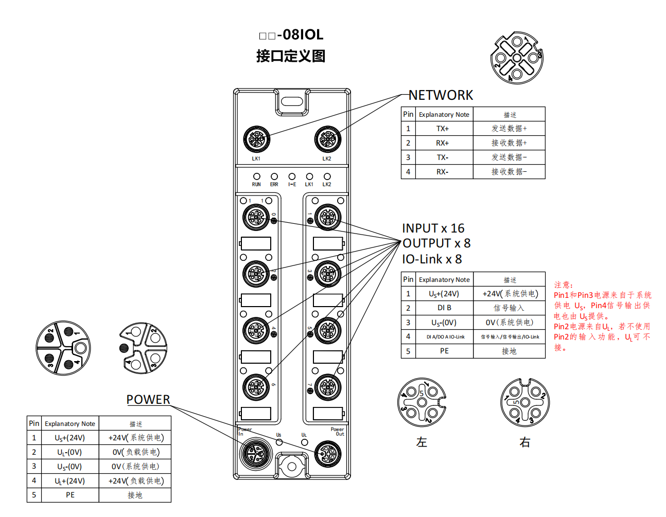 電源接口:Power In:1×M12,L-Code,4P針;Power Out:1×M12,L-Code,4P孔