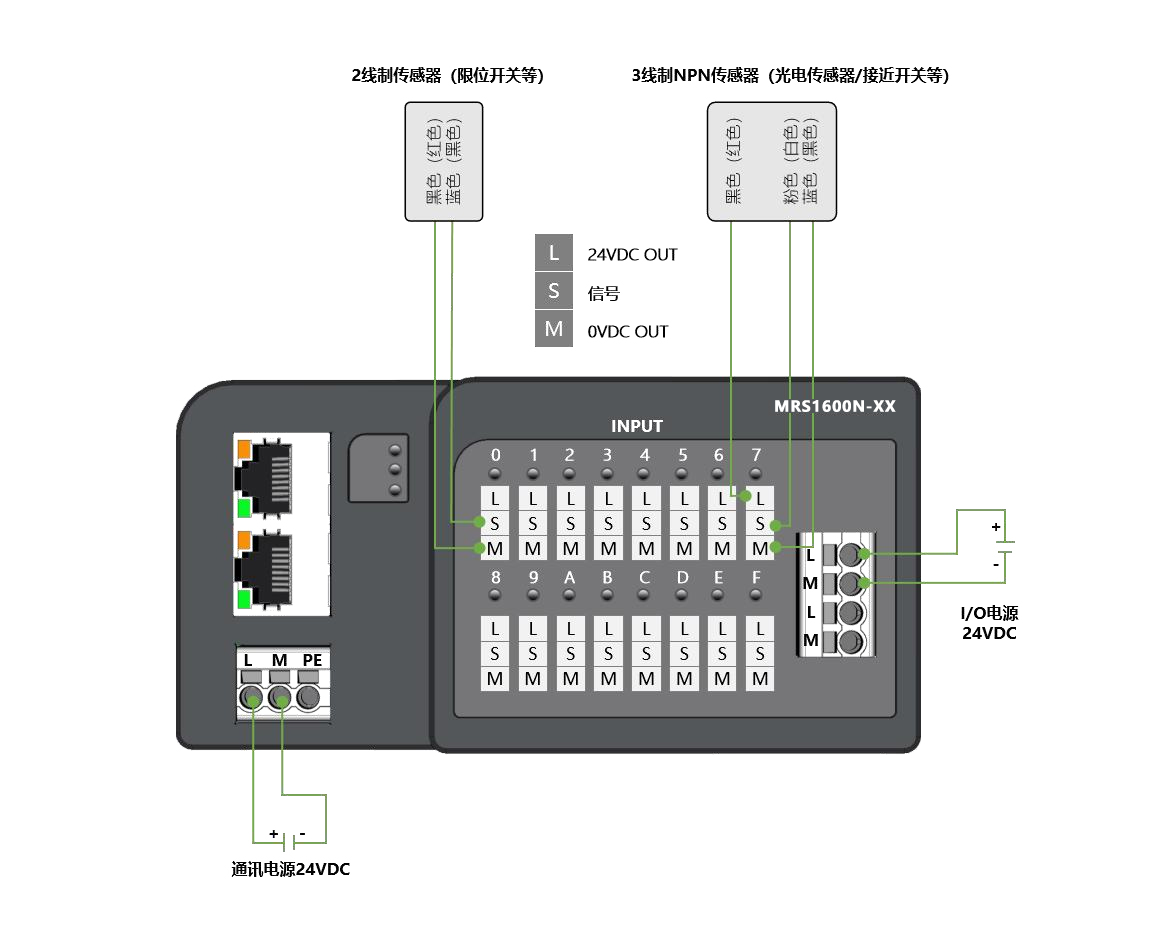 面板式快接線分布式I/O,CC-Link IE FiledBasic通訊,2xRJ45,可級聯;數字量16入 NPN,24VDC,歐式彈簧端子;導軌安裝&打孔安裝(下單時需備注)