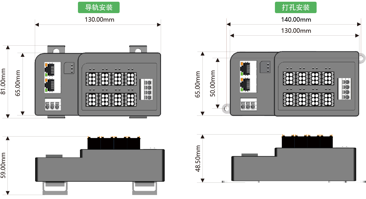 安裝方式:DIN35導軌安裝或雙側耳打孔安裝