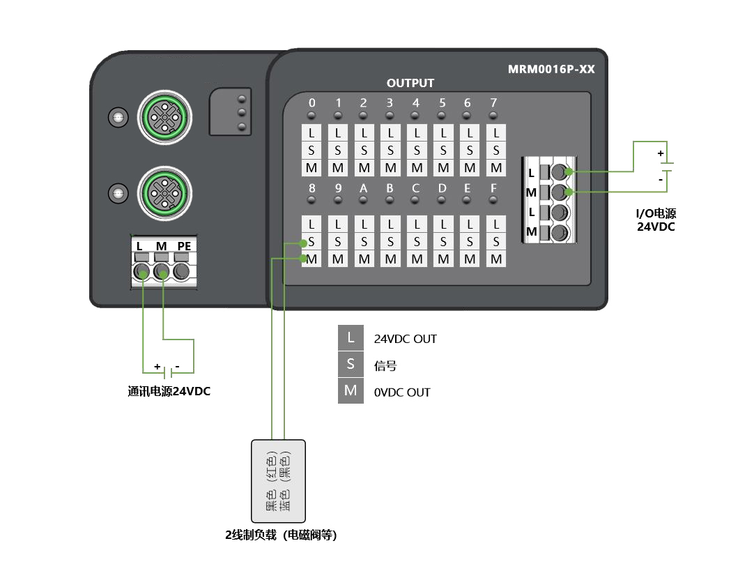 面板式快接線分布式I/O,EtherNet/IP通訊,2xM12,可級聯;數字量16出 PNP,24VDC,0.5A,E-con連接器;導軌安裝&打孔安裝(下單時需備注)