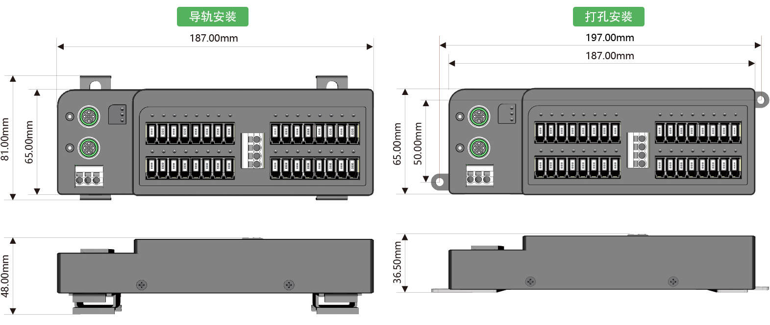 安裝方式:DIN35導(dǎo)軌安裝或雙側(cè)耳打孔安裝